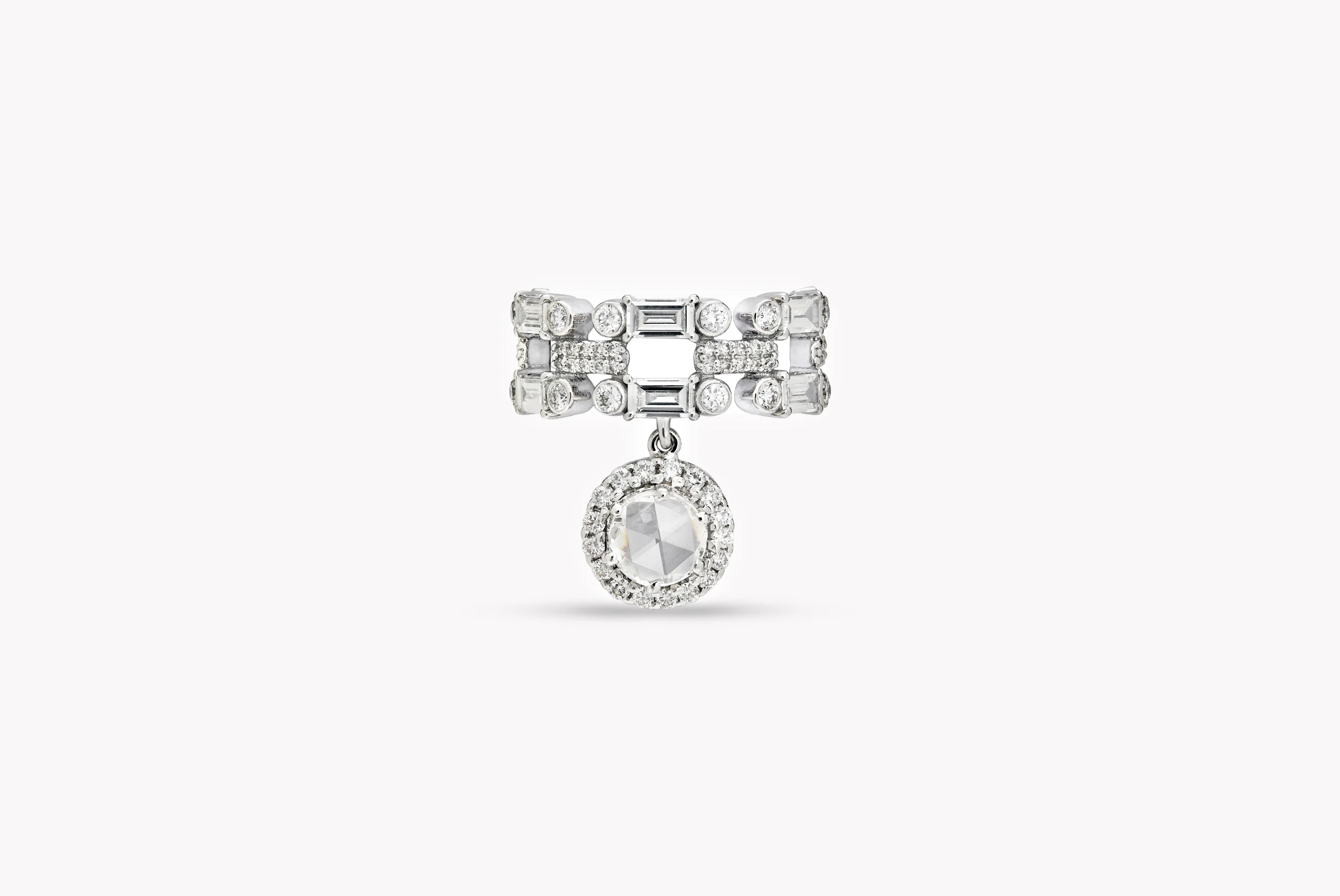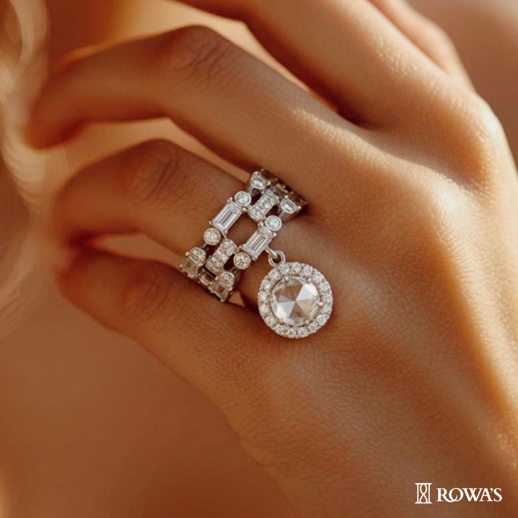 The Deco Dream Rosecut Diamond Ring is inspired by the opulence and geometric elegance of the Art Deco era. The central rose-cut diamond, surrounded by a halo of shimmering round diamonds, captures the essence of 1920s glamour and sophistication. The band, adorned with a mix of baguette and round diamonds, reflects the intricate and bold patterns characteristic of Art Deco design. This ring is a tribute to the timeless allure of the Jazz Age, blending vintage charm with contemporary style. It’s perfect for those who appreciate the fusion of classic elegance and modern luxury.