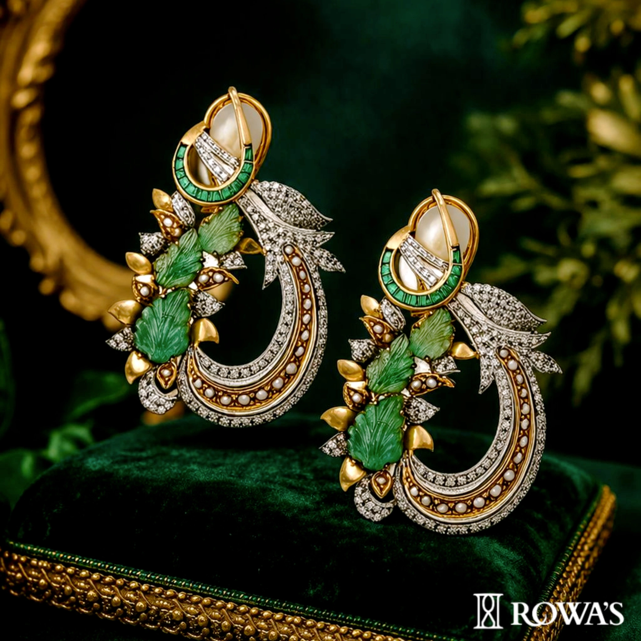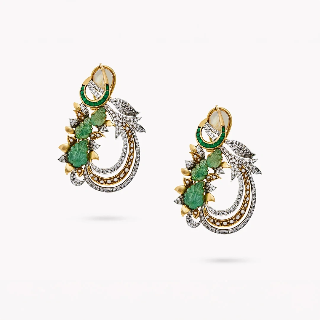 The Feuilles Emerald Majesty Earrings are inspired by the lush foliage and intricate beauty of royal gardens, as well as the detailed designs of historical tapestries. The central carved emerald leaves, or “feuilles,” represent the natural elegance and vibrant greenery found in these majestic settings. These earrings are perfect for those who appreciate the harmony of nature and royal artistry, making a statement of refined elegance and grandeur.