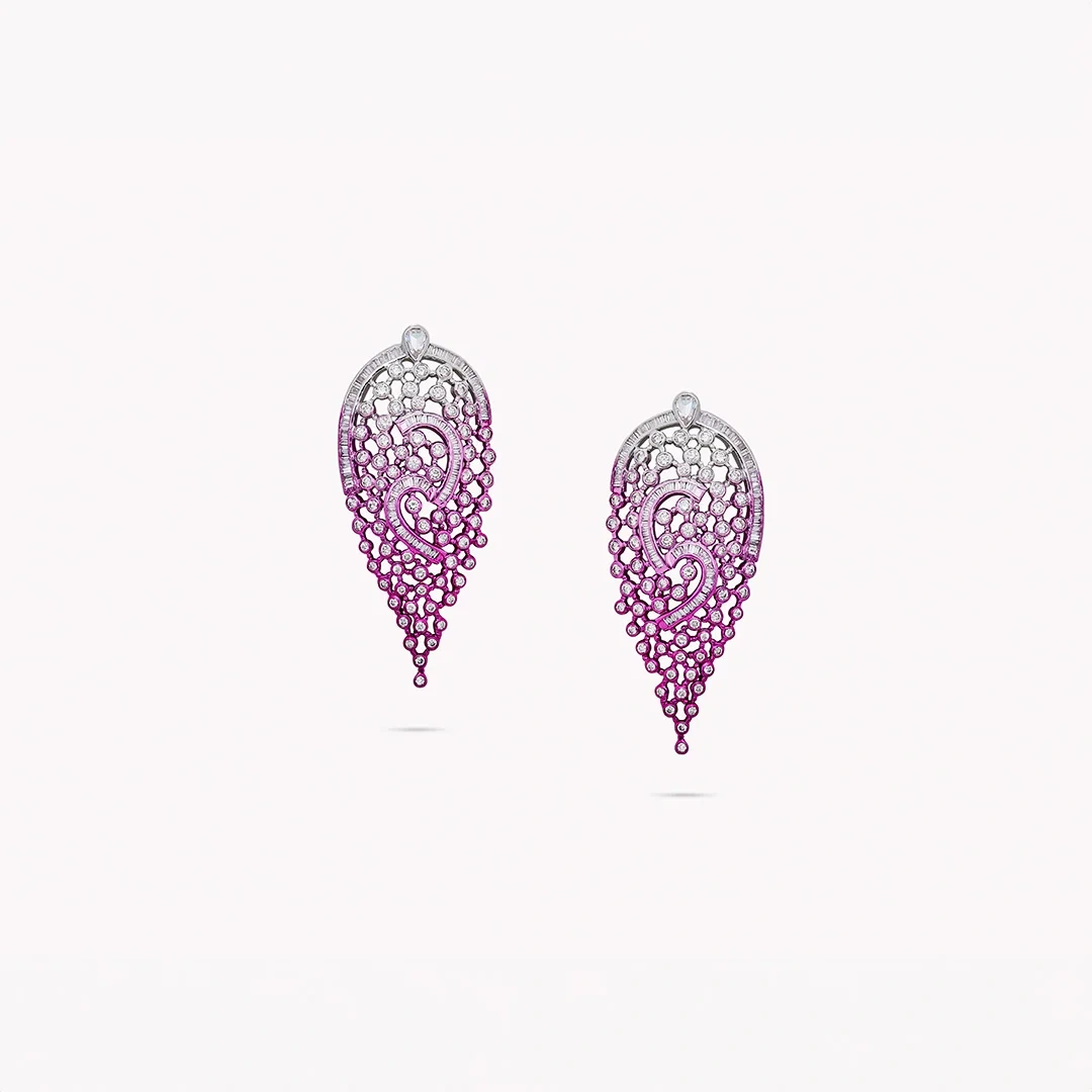 The Radiant Lace Earrings are a celebration of intricate beauty and delicate craftsmanship, inspired by the timeless elegance of lace patterns. These earrings combine the soft, romantic hues of pink rhodium with the sparkling brilliance of diamonds, creating a stunning visual effect. The intricate design mimics the delicate weave of fine lace, symbolizing grace and femininity. Each diamond is meticulously set to enhance the overall radiance, reflecting light in a mesmerizing dance. These earrings are perfect for those who appreciate the fusion of classic elegance with modern sophistication, making a statement of refined beauty and timeless charm.