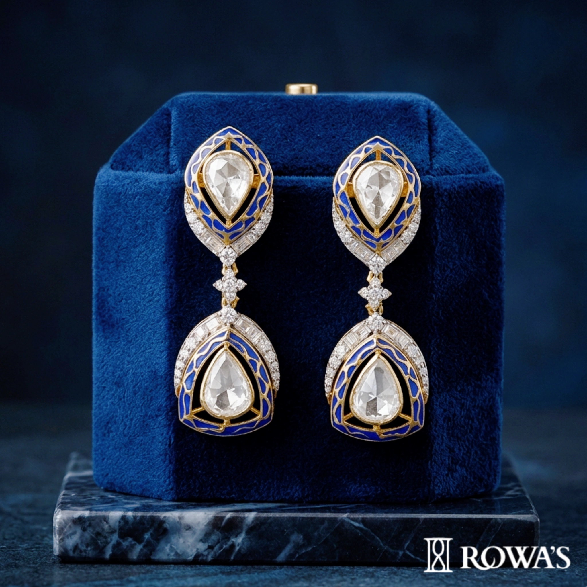 Radiating royal grandeur, these drop earrings showcase intricate latticework and regal sophistication. The lavish ornamentation, bold enamel, and diamond accents reflect an art deco style with geometric precision, making these earrings a statement of timeless luxury.