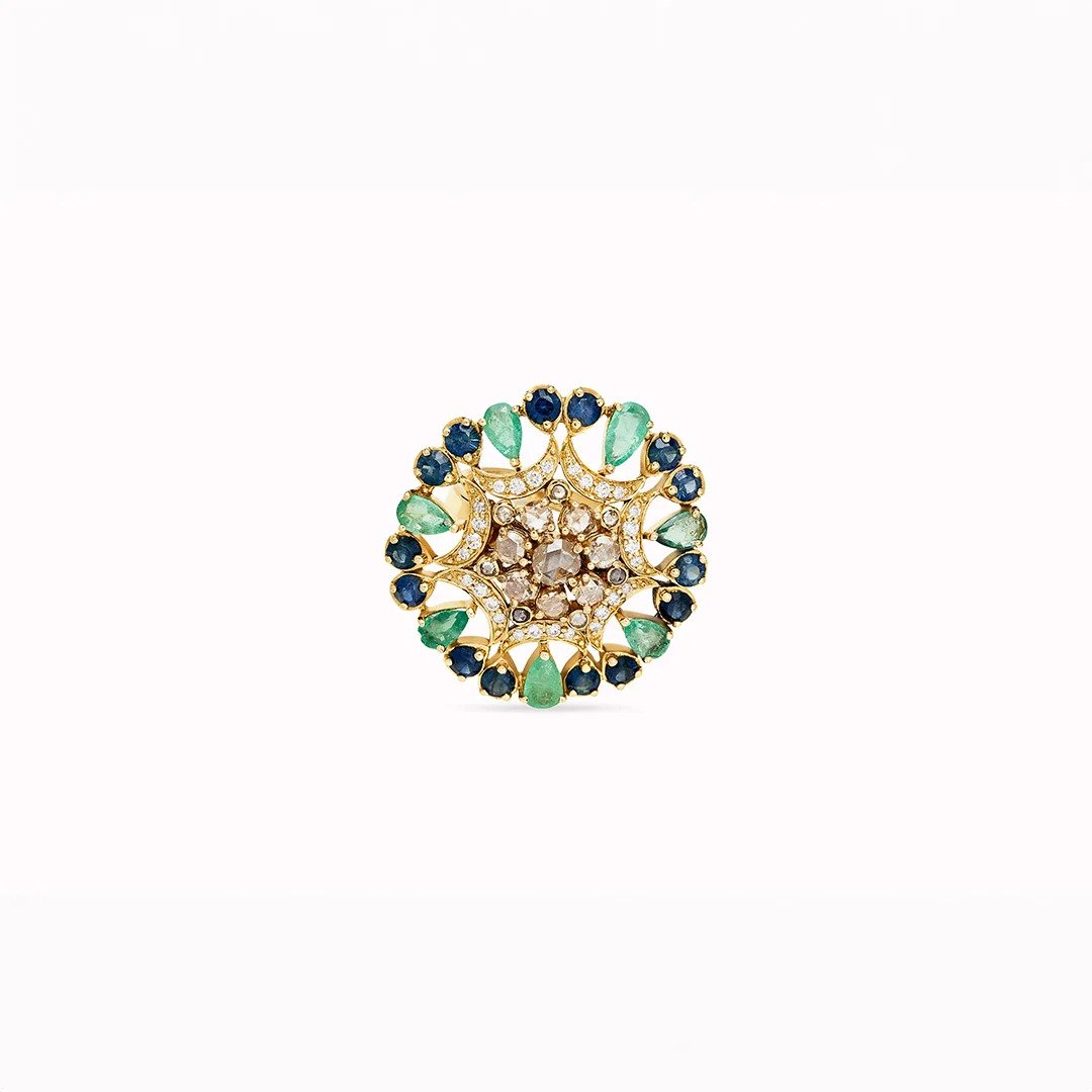 Inspired by the intricate designs of royal tapestries, the Royal Tapestry Ring features a central cluster of diamonds surrounded by alternating emerald and sapphire motifs. The elaborate pattern reflects the richness and sophistication of regal art, making this ring a perfect statement piece for those who appreciate luxurious craftsmanship.